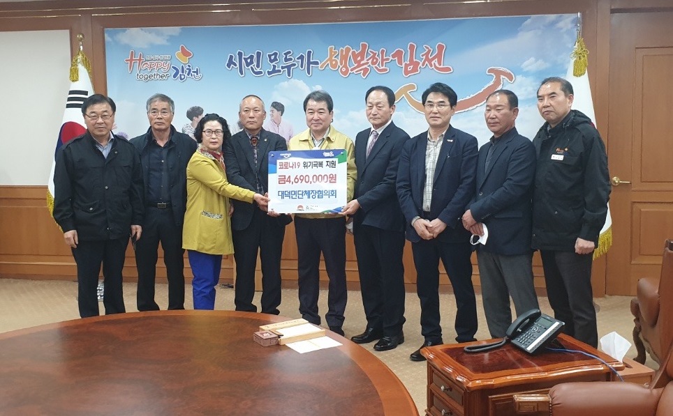 | 김천시 대덕면 단체장 협의회에서는 지난 26일 김천시청을 방문하여 코로나–19 극복을 위해 성금 469만원을 기탁하였다.