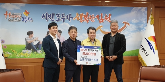 | 김천시 서포터즈(회장 이만수)는 코로나19 확산으로 어려움을 겪고 있는 시민들을 위해 사용해 달라며 자체 모금한 성금 200만원을 27일 김천시에 전달했다.