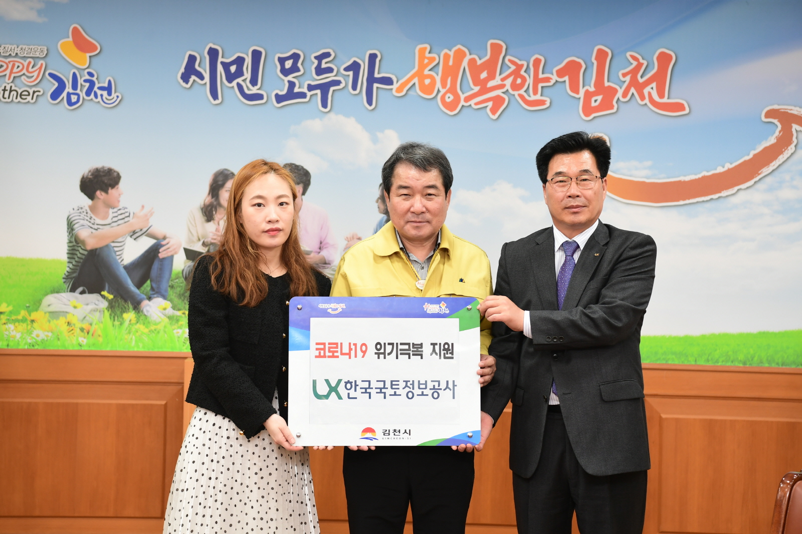 | 한국국토정보공사 김천지사는 지난 27일, 코로나19 로 힘들어 하는 시민들을 위해 써 달라며 전 직원이 자발적으로 모은 성금을 우리시에 기탁을 하였다.