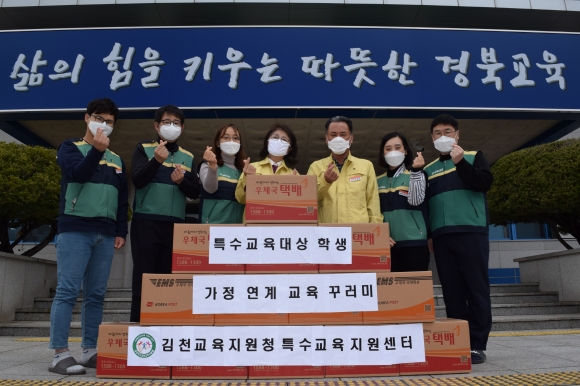 | 김천교육지원청(교육장 마숙자)은 30일(월)에 특수교육대상학생을 위해‘가정연계 교육 꾸러미’를 지원하였다. 이번 지원은 코로나19 감염병 확산 방지를 위해 개학이 연기됨에 따라 가정에서 보내는 시간이 많아진 재택순회교육 특수교육대상 학생 13가정을 대상으로 실시되었다.