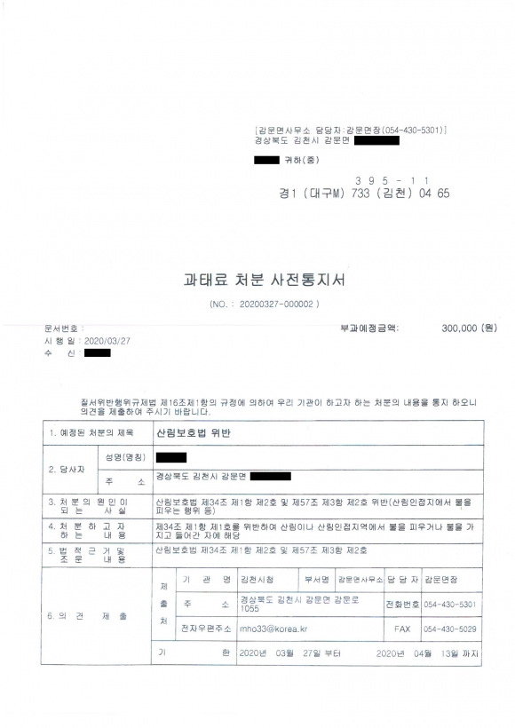 감문면 산림보호법 위반 과태료 부과