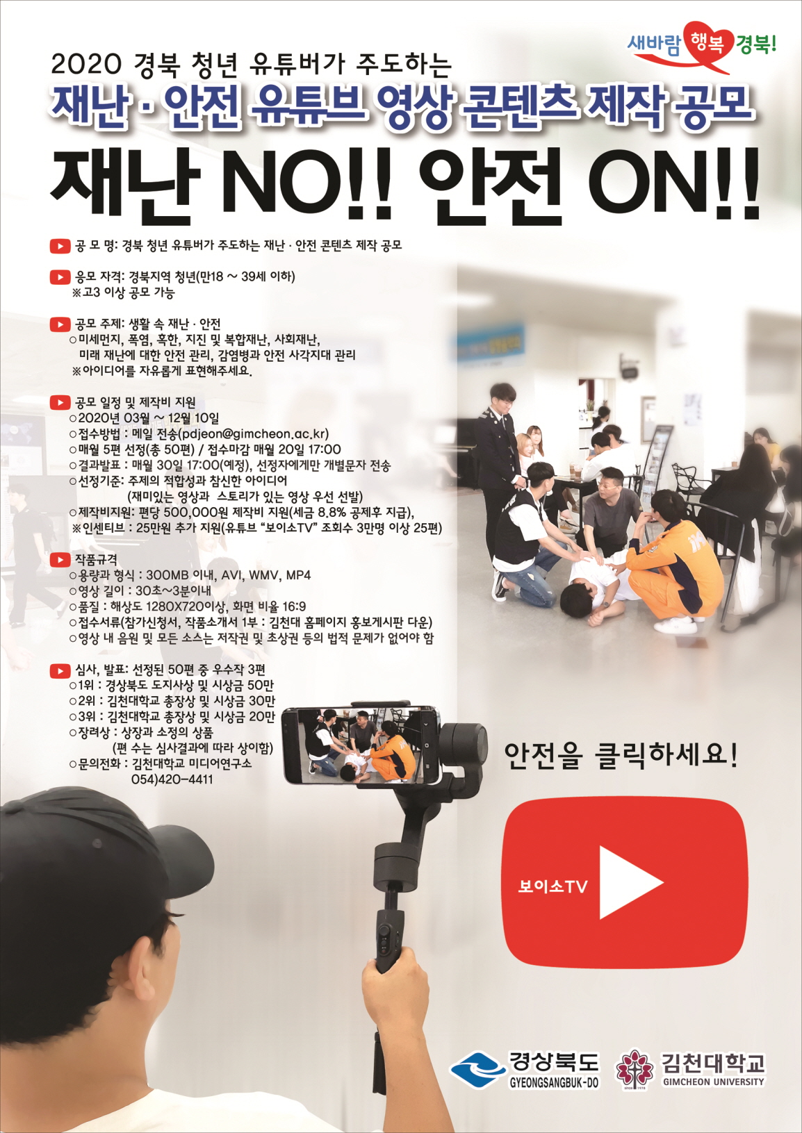 | 경상북도(도지사 이철우)와 김천대학교(총장 윤옥현)가 함께하는 『경상북도 청년 유튜버가 주도하는 재난⋅안전 영상 콘텐츠공모전』이 2020년 3월부터 12월까지 펼쳐진다. 당초 계획에 의하면 3월부터 시행 예정이었으나 코로나19로 인해 1개월 늦춰진 4월부터 본격적으로 사업이 진행된다.