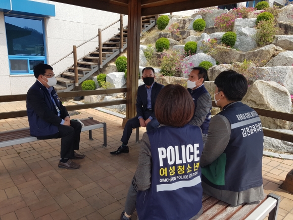 | 김천경찰서(서장 우지완)는 개학 추가 연기로 청소년의 비행 예방에 선제적으로 대응하고자 4월 2일, 교육지원청 앞 야외벤치에서 교육지원과장 및 교육지원청 담당 장학사와 경·학 상설협의체를 개최하여 청소년 사이버 성폭력 예방 대책을 논의하였다.