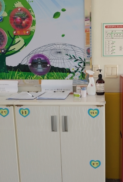 | 대룡초등학교는 개학을 대비하여 교직원 및 학생 안전에 전교직원 지혜를 모아 코로나19 대비 계획을 세우고 하나하나 실천하고 있다. 우선, 마스크를 미리 확보하여 개학하고 8주 정도는 충당할 수 있도록 물량을 확보하고 있다. 그리고 면마스크도 발 빠르게 2장씩(필터교체형, 국산, 면100%) 구입을 해놓은 상태이다. 다음으로, 개인별 100ml 손소독제를 준비하여 제공하고자 한다. 동시에 학생들의 손 보호를 위하여 핸드크림 70ml짜리도 역시 준비 하였다. 공통으로 복도 및 세면대, 화장실에 비치된 소독제, 반별손소독제, 반별분무소독제, 개인별 소독제 4중 안전 장치를 두었다. 복도에는 자동 손소독기를 배치하고, 복도 세면대와 화장실 세면대에 물비누 등을 충분히 비치하였다. 교실은 담임 선생님이 직접 수시로 학생들 손이 많이 가는 곳을 소독할 예정이다. 복도와 화장실은 청소원이 본인이 일 할 하루 분량의 70%를 소독에 종사하는 것으로 이야기가 되어 있다.