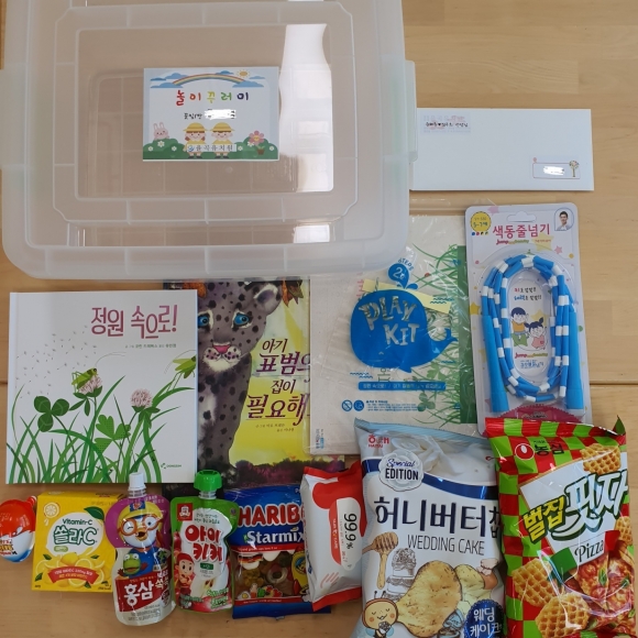 놀이꾸러미에는 훌라후프, 공, 줄넘기와 같은 신체표현 놀이자료, 손소독 티슈, 동화책 등으로 구성되었는데 유아의 신체·건강, 언어표현능력을 신장하기 위한 물품으로 가득 담겨 있었다. 특히 유아들이 놀이에 몰입할 수 있도록 놀이 방법을 소개하여 가정에서도 쉽게 활용할 수 있도록 하였다.