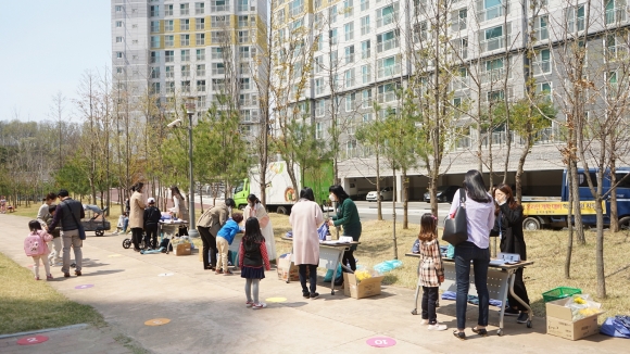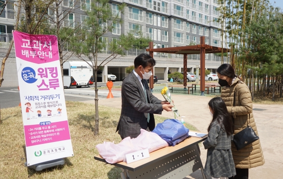 배움자료집과 놀이·학습준비물을 모아 만든 학습꾸러미를 4월 9일부터 학년별 순차적으로 가정에 전달하였다. 아파트별로 단지 앞 공터에 배부 부스를 설치하고 사회적 거리를 유지한 채로 첫 만남이 시작되었다. 교과서, 학습 준비물, 입학 선물, 손소독제 등이 가득 담긴 학습 꾸러미를 건네 받은 신입생들의 입가에 미소가 번졌다. 각 학반 담임 교사는 ‘천진난만, 당신의 시작을 응원합니다’등의 꽃말을 가진 후리지아 꽃다발을 전달하며 학생들의 입학을 응원했다.