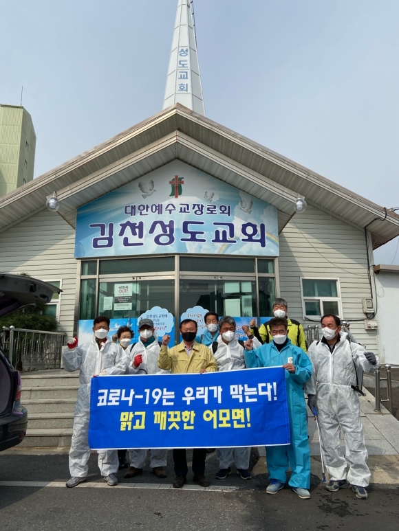| 어모면 이장협의회는 지난 11일 코로나19의 “사회적거리두기” 연장과 관련 하여 많은 사람들이 모이는 다중집합장소인 종교시설을 중심으로 대대적인 방역소속을 실시하였다.