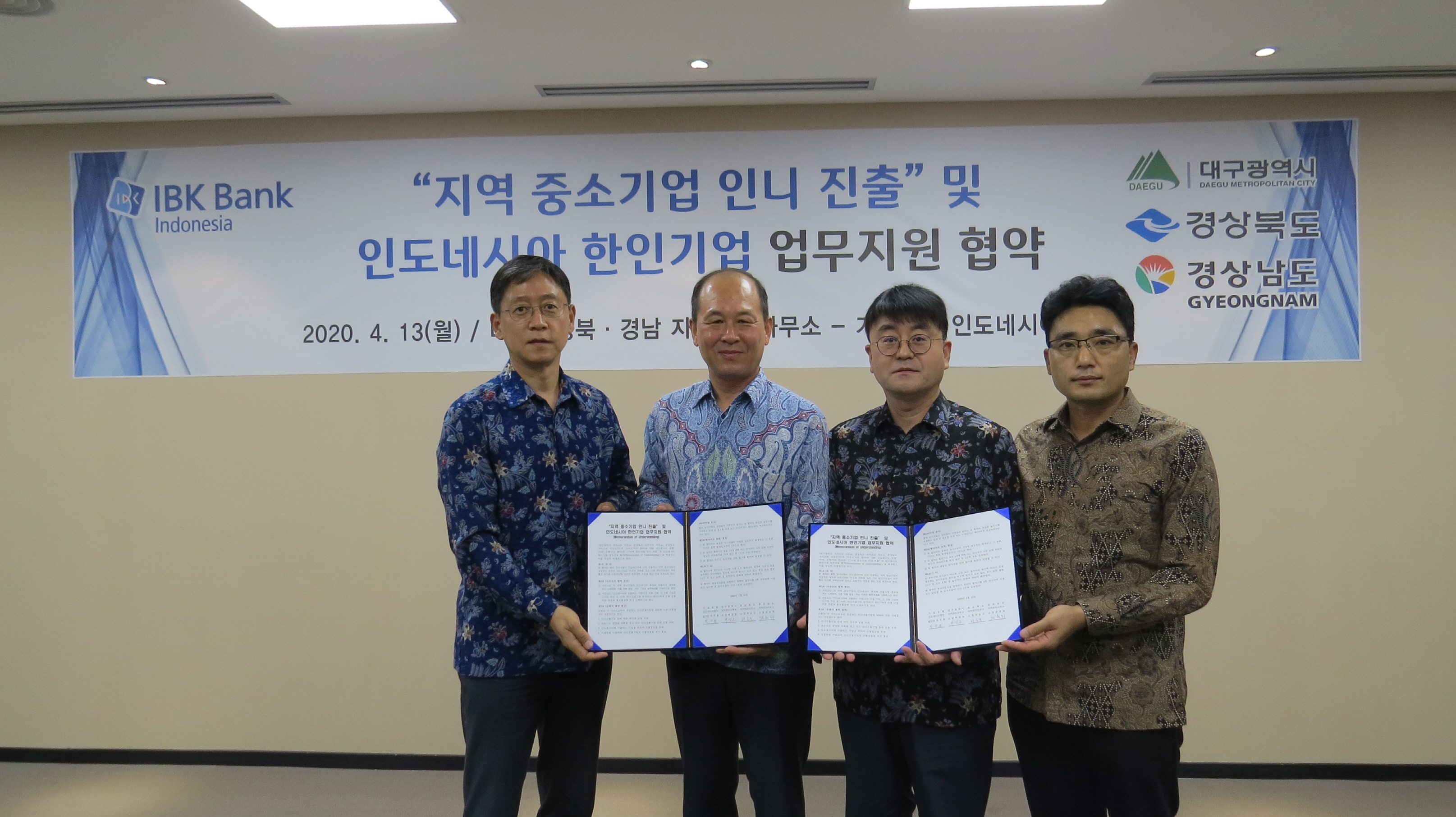 | 인도네시아 대구-경북자카르타사무소(경북 소장 최순규, 대구 소장 박성호)는 경남자카르타사무소와 함께 코로나19로 수출 및 운영에 어려움을 겪고 있는 지역 중소기업을 지원하고자 지난 13일 기업은행 인도네시아법인과 ‘지역 중소기업 인도네시아 진출 및 인도네시아 한인기업 지원 업무 협약’을 체결했다. 이날 협약을 통해 인도네시아(이하‘인니’)에 진출하는 지역 중소기업은 각 지역 사무소의 추천을 통해 기업은행에서 ▲인니 진출기업 여신지원 우대 ▲코로나로 경영에 어려움을 겪고 있는 인니 내 한인기업 금융지원 ▲인니 수출기업 수출입금융 우대 ▲은행 지점망을 이용한 지역 수출상품 홍보 등 금융우대와 제품 홍보 지원을 받을 수 있게 됐다.