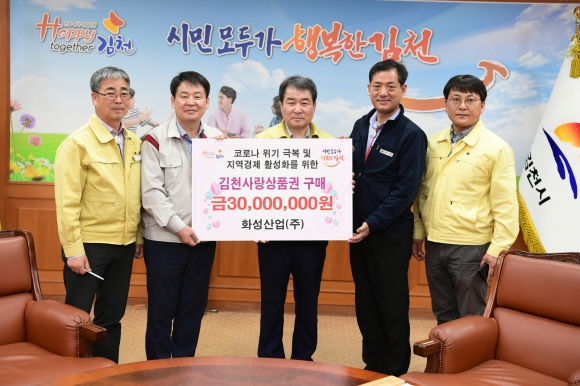 | 김천시 강남북 연결도로 개설공사 시공사인 화성산업(주)는 코로나19 극복 및 지역경제 활성화에 힘을 보태기 위해 김천사랑상품권 3,000만원을 구매하였다.