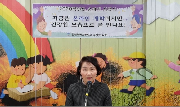 | 코로나-19로 인한 사상 초유의 온라인 개학을 맞이하여 김천부곡초등학교(교장 김경숙)는 4월 16일에 온라인 시업식을 실시하였다. 예년 같으면 새 학년을 시작하는 첫 날, 설레는 마음으로 등교한 아이들의 재잘대는 소리와 즐거운 웃음소리가 가득했을 학교이지만, 이날 교정에서는 긴장감과 적막감마저 감돌았다.
