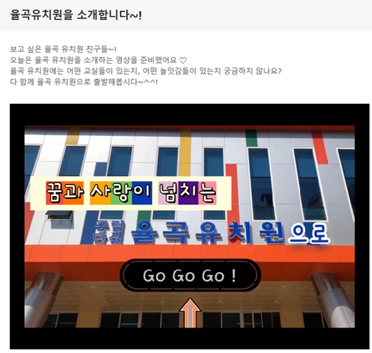 | 율곡유치원(원장 장미야)은 개학 연기 장기화에 따라 보다 체계적인 유아 놀이 활동 지원 체제를 구축하여 유아 및 학부모들에게 온라인 놀이 활동을 적극적으로 지원하고 있다. 온라인 놀이 활동 지원으로 유치원 교육 활동 공백에 대한 불안감 해소 및 공교육에 대한 신뢰를 높이고 가정에서 부모님과 함께할 수 있는 놀이꾸러미를 제공함으로써 유치원 교육활동 적응도를 높이기 위해 기획되었다