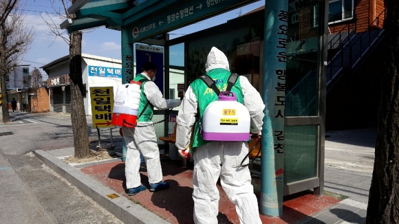 이에 김천시는 22개 읍면동의 새마을남녀지도자협의회, 이통장협의회 등 조직 단체에 방역활동 참여 협조를 요청하여 버스 정류장, 다중이용시설 등 시민 생활주변의 방역취약지에 대해 철저한 방역을 실시하고 있다.