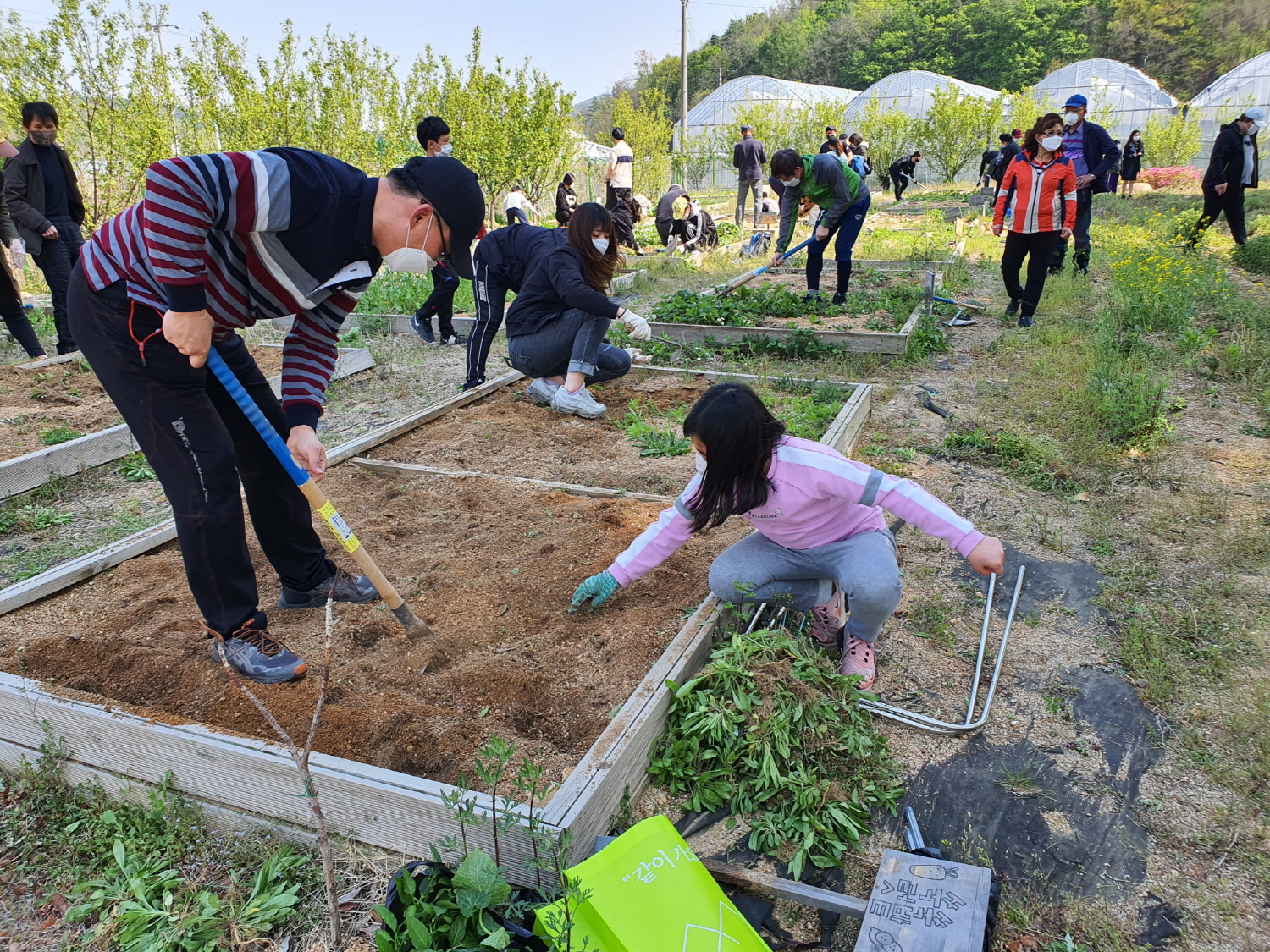 텃밭을 분양받은 가족들은 읍면동 새마을회장들의 도움을 받아 이랑 만들기, 멀칭 작업(경지토양의 표면 덮기)을 진행하였고 새마을회에서 준비한 모종(대추방울토마토, 비트, 오이, 가지 등)과 각자 준비해온 모종을 심는 등 텃밭 조성에 정성을 쏟았다.