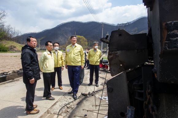 | 경상북도의회 장경식 의장과 농수산위원회 김성진 의원은 4월 27일 산불 피해 농가를 입은 안동시 남후면 고하리 돈사를 방문해 농장 주인을 위로하고 향후 피해보상 대책 등을 함께 논의했다.
