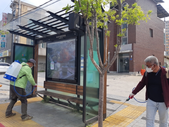 지좌동 새마을협의회, 버스정류장 등 코로나19 방역활동 전개