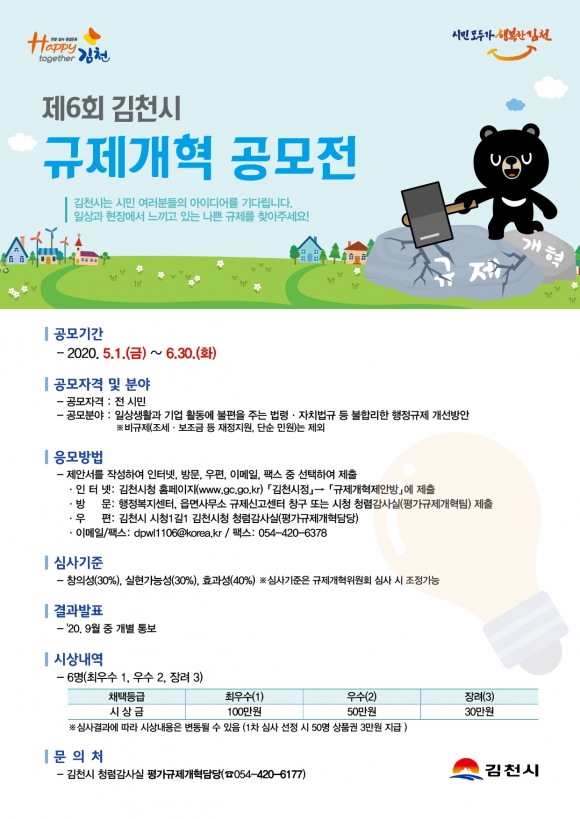 | 김천시(시장 김충섭)는 일상과 현장에서 느끼고 있는 불합리한 규제를 발굴․개선하기 위해 5월 1일부터 6월 30일까지 ⌜제6회 김천시 규제개혁 공모전⌟을 진행한다.