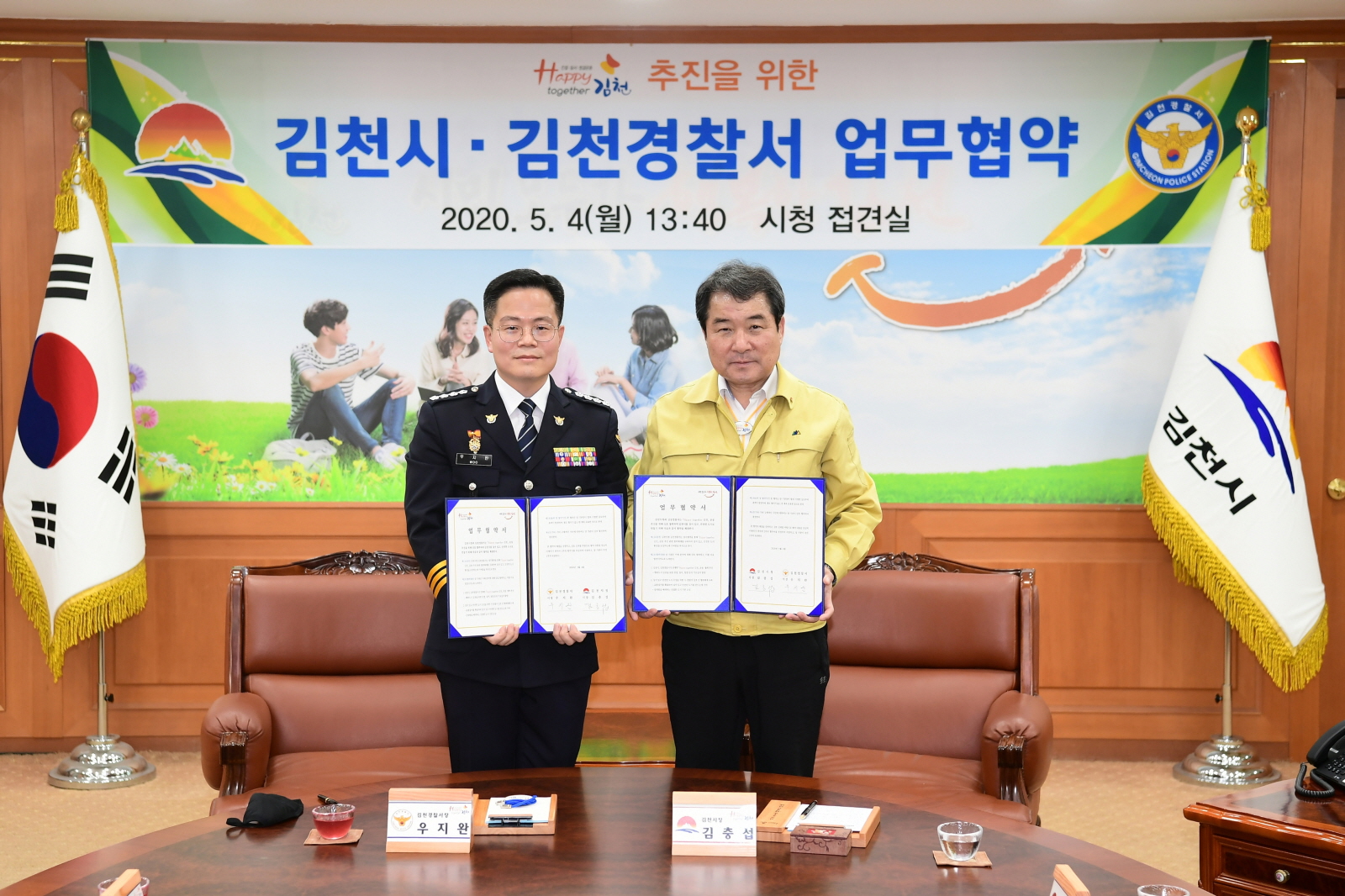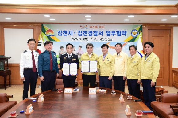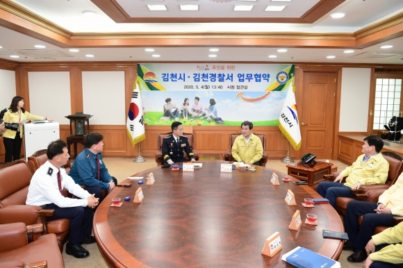 | 김천시와 김천경찰서는 4일 김천시청 접견실에서 김충섭 김천시장과 관계공무원, 우지완 김천경찰서장과 생활안전과장, 교통관리계장 등이 참석하여「Happy Together 김천」운동 추진의 유기적 협력체계 구축을 위한 업무협약을 체결했다.