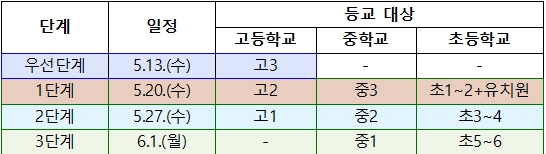 경북교육청(교육감 임종식)은 오는 13일부터 고등학교 3학년과 소규모 초·중학교(337교)를 대상으로 단계적·순차적 등교 수업을 시작하기로 했다. [학년별 등교수업 시작 시기]