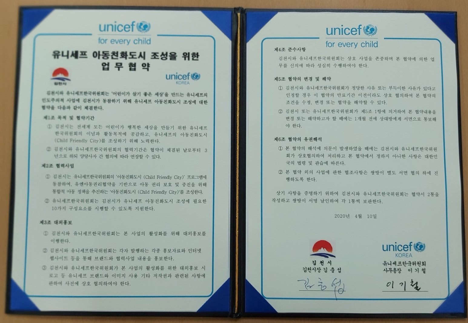 코로나-19 확산방지 등 지역 여건을 고려하여 서면으로 진행된 이번 협약은 아동친화도시 조성사업을 통해 아동이 행복한 도시, 아동의 건강한 성장과 발달이 보장되는 김천시를 만들기 위해 유니세프의 아동친화도시(Child-Friendly City) 사업에 김천시와 유니세프한국위원회가 함께한다는 선언적 의미를 담고 있다.