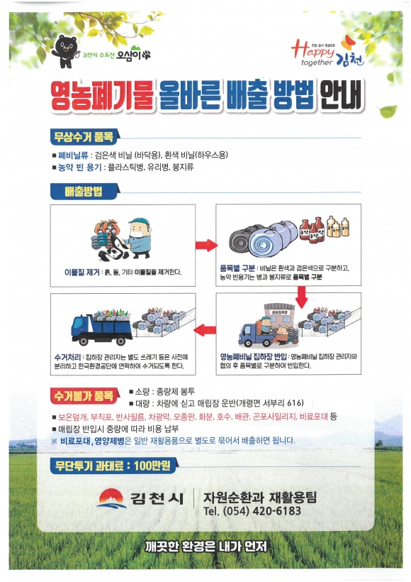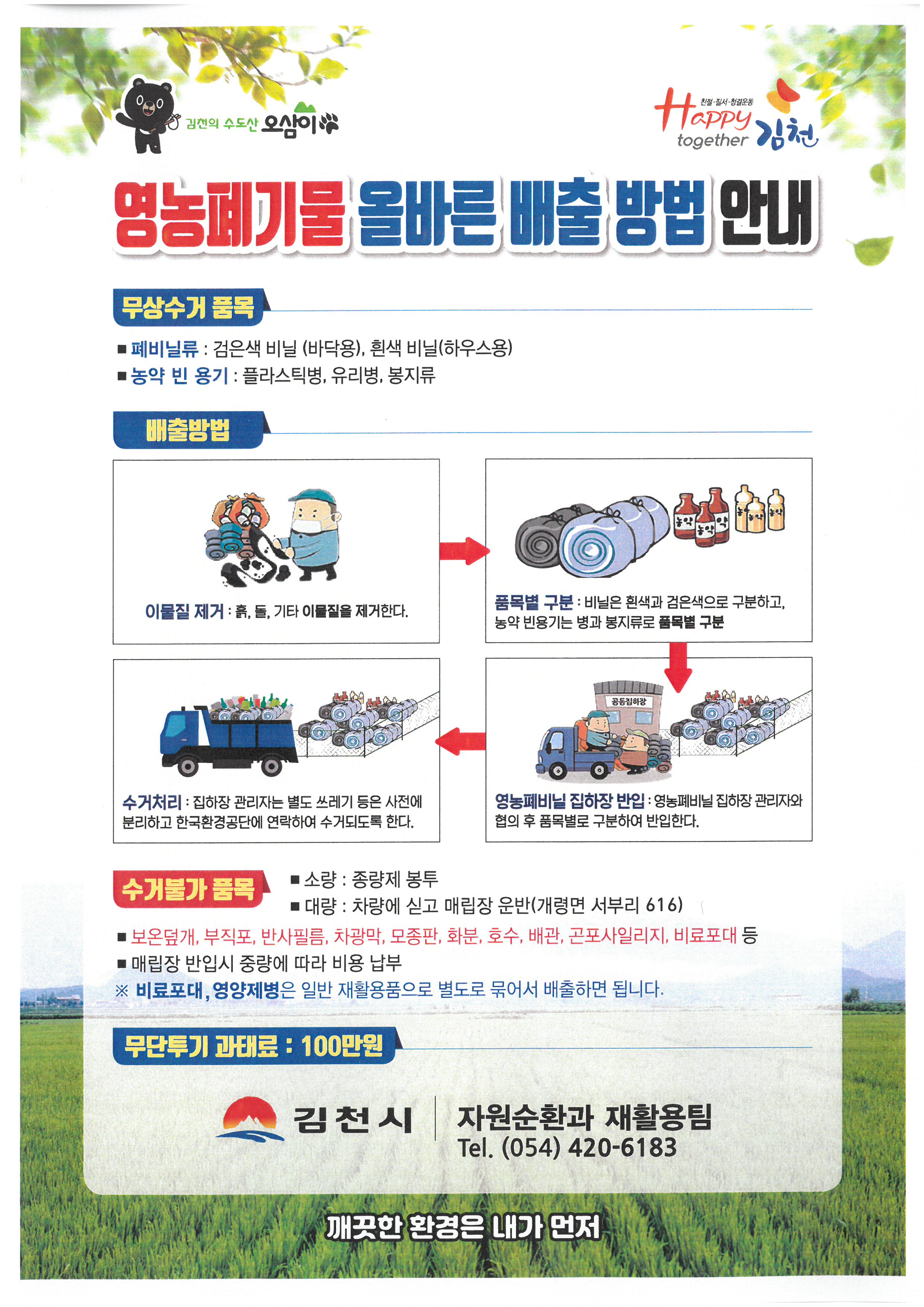 덧붙여, 영농과정에서 발생하는 보온덮개, 반사필름 등이 제때 처리되지 않고 농촌주변에 적치되고 있는 실정이나, 이는 재활용이 되지 않는 품목으로 농가에서 비용을 부담하여 대형폐기물로 처리해야 하며 대형폐기물 처리방법은 동지역은 자원순환과(420-6195)로, 읍·면지역은 해당 읍·면사무소로 접수 처리하면 된다.