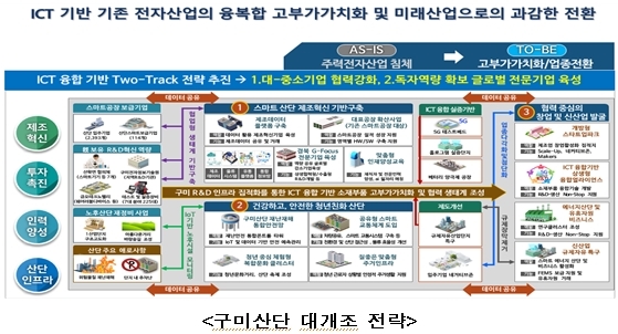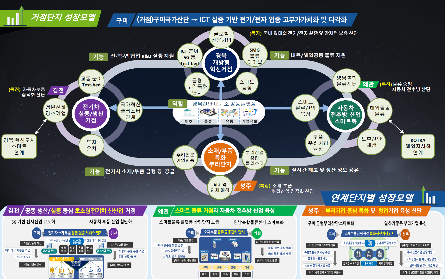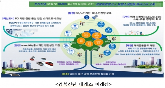 경북 산단 대개조사업은 구미 국가산단을 거점산단으로 인근의 김천 1산단과 김천 혁신도시, 칠곡(왜관)산단, 성주산단을 연계하여 ‘전자산업 부활 및 미래차 신산업 육성을 위한 경북 특화형 ICT 융합 소재부품 클러스터 구축'하는 사업이다