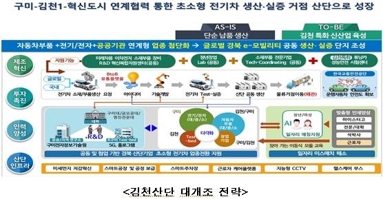 김천 1 산단은 초소형 전기차 산업 인프라 및 실증 인프라(Test-bed)가 구축되어 있고, 혁신도시 장점을 활용, 거점-연계-혁신기관 간 공동협력이 가능한 강점을 지니고 있어 연계산단으로 정하였다
