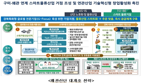 | 칠곡(왜관) 산단은 경북 소재부품 특화형 글로벌 전문기업 육성을 위한 스마트 물류산업 거점단지 조성 및 관련 산업 육성을 통해 G-Focus 소재부품 기업의 효율적 국내 물류 및 원활한 해외 진출이 가능하도록 할 계획이다
