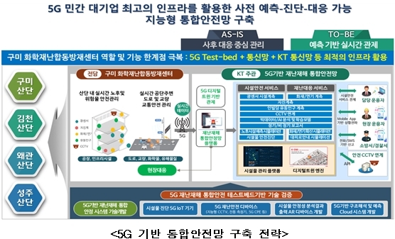 기 구축된 구미 화학재난합동방재센터의 역할 및 기능을 확대하고 5G 통신망을 가진 대기업의 주도적 참여를 통해 실시간 모니터링이 가능한 지능형 통합안전망을 구축해 기존 사후 관리 위주의 안전대책에서 예측-진단-사전 대응이 가능한 안전관리체계로 전환해 안전 혁신 산단, 재난 Zero 산단을 이룬다는 계획이다