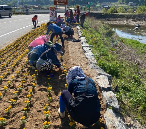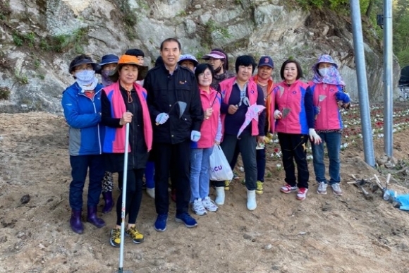 침체된 면민들의 마음에 봄기운을 선사할 연도변 꽃길이 생활개선회의 구슬땀으로 완성되었다.