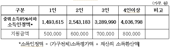 ※ 지원기준은 가구원수별 소득인정액* 이하 이어야 한다.