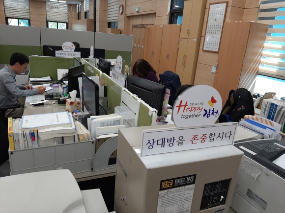 | 김천시 세정과는 가정의 달 5월을 맞이하여 코로나-19의 영향으로 일상에 지치고 어려움을 겪고 있는 시민들에게 친절하고 배려하는 마음가짐을 한번 더 다지기 위해 “Happy together 김천”운동을 새롭게 시작한다는 하나 된 마음으로 Happy together 김천운동 표찰을 자체제작, 사무실 개개인 책상 위에 설치하였다.