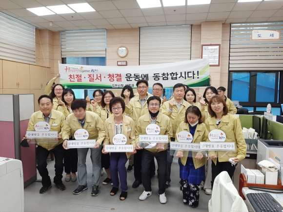 김경희 세정과장은 “어려운 시기에 내방하는 시민들에게 감동받는 민원서비스가 제공되도록 세정과 직원들은 작은 것부터 실천하여 언제나 처럼 신뢰받는 세정행정을 구현하는데 우리 모두 최선을 다 해 나가자” 라고 밝혔다. 이번 첫 주의 실천과제는 서로 간 배려하는 마음을 가지자는 의미로 “상대방을 존중합시다”이다.