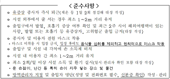 한편, 집합금지 시설 외 유흥시설에서는 준수사항*을 반드시 이행하여야 하며 운영을 자제하도록 권고한다. 방역수칙을 위반할 시 마찬가지로 집합금지 명령을 내릴 수 있고, 구상권을 행사 할 수 있다.