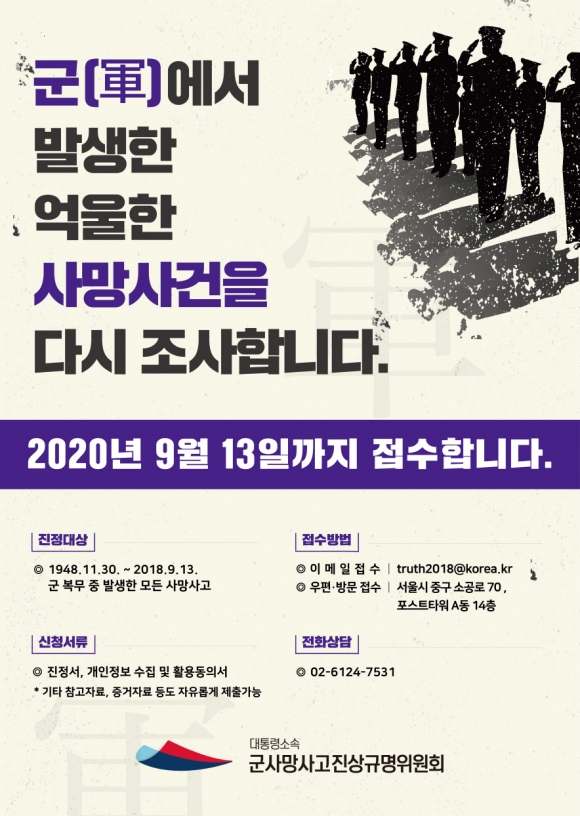 「대통령소속 군사망사고진상규명위원회」는 특별법에 따라 2018년 9월 설립되었으며, 3년의 활동기간 동안 군대에서 발생한 사망사고에 대해 유가족이나 목격자 등의 진정을 받아 공정하고 객관적인 조사로 진실을 규명하는 업무를 수행한다.