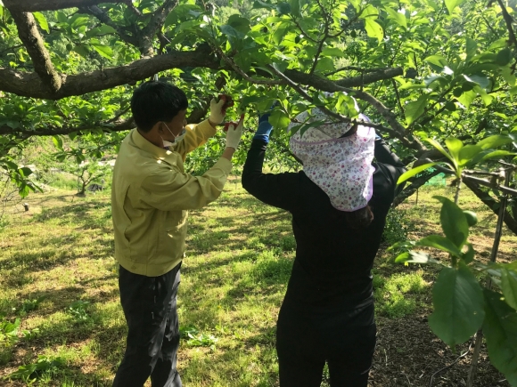 이날 자두 농가를 찾아 적과작업에 참여한 감천면 직원들은 서툰 농사일이지만, 구슬땀을 흘리며 최선을 다해 작업에 임하였다.