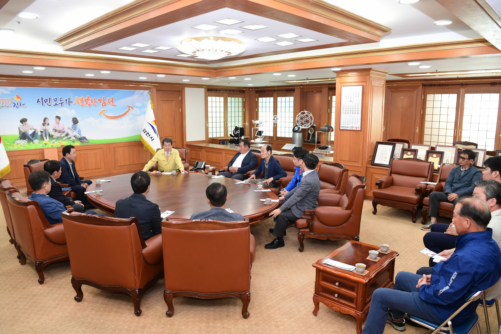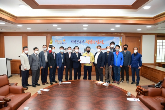 | 김천시 체육인대표, 상인회 대표 등 12명은 지난 13일에 김충섭 시장, 김세운 시의회의장을 잇따라 방문하고 상무프로축구단 김천 유치를 희망하며 유치 건의문을 전달했다.