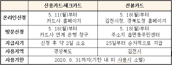 김천시에서는 시청 홈페이지 온라인 신청 및 읍면동 주민센터 방문 신청 시 종이 상품권이 아닌 선불카드로 지급한다. 선불카드는 김천시 관내에서만 사용이 가능하고 사용기한은 8월 31일까지로 기간 내 사용하지 않은 잔액은 소멸된다.