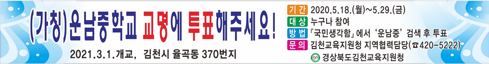 홈페이지 주소 http://epeople.go.kr (포털사이트에서 국민신문고 혹은 국민생각함 검색 가능)에서 진행되며, 2020. 5. 18.(월)부터 5. 29.(금)까지 12일간 투표가 가능하다. ※ 회원가입(국민신문고) →「국민각함」→ ‘생각찾기’에서 ‘운남중’검색 → 해당 안건 클릭 → 마음에 드는 교명 선택 → ‘투표하기’ 클릭