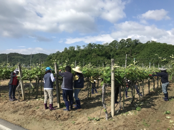 이날 직원들은 바쁜 업무 중에도 필수 인원을 제외하고 이른 아침부터 약 2,000㎡의 포도밭에서 적순작업을 실시하였다.