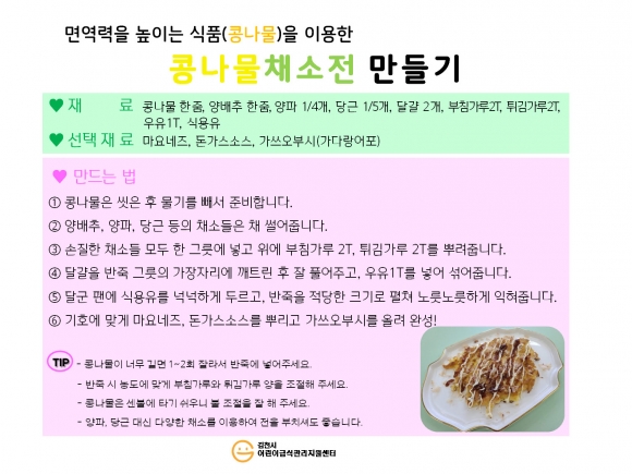 | 김천시 어린이급식관리지원센터(이사장 김재광)에서는 면역력을 높이는 식품 중 하나인 콩나물과 콩나물을 이용한 레시피를 소개한다.