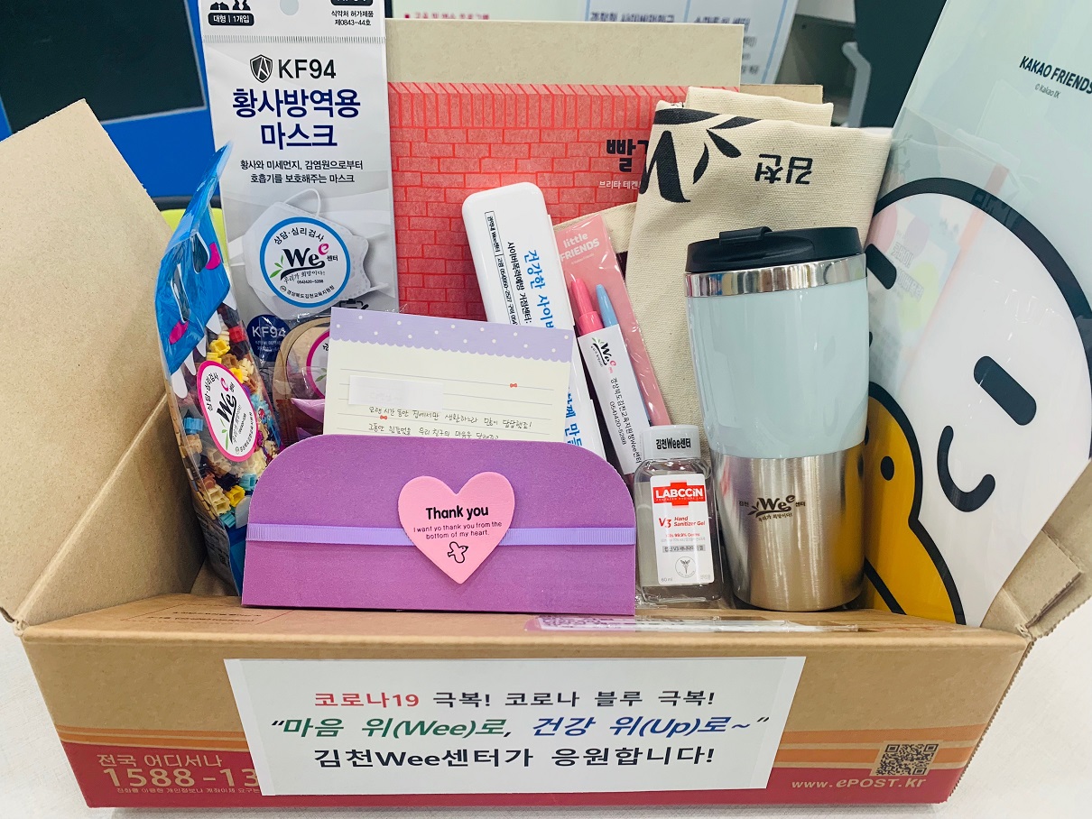 김천Wee센터는 코로나19로 지쳐 있을 학생 및 학부모를 격려하고, 등교 개학을 응원하기 위한 목적으로 도서 및 물품을 지원하는 행사를 진행하였다. Wee센터 개인상담 및 New-Start프로그램에 참여한 학생 30여명을 선정하여 마음 방역을 위한 도서 및 손편지, 신체 방역을 위한 여러 가지 물품을 넣은 선물꾸러미를 우편으로 발송했다. 학생과 학부모에게 전화 상담을 실시하여 코로나19로 인한 현재 심리 상태를 파악하고, 앞으로 순차적으로 진행될 등교 개학에 대한 불안을 줄일 수 있도록 격려하였다. 선물꾸러미에 독서치료를 위한 도서와 질문지, 등교를 격려하는 손편지, 마스크, 손소독제, 디폼블럭, 문구류, 간식, 홍보물 등을 넣어 우편으로 발송함으로써 작지만 등교 개학과 학교생활 응원의 메시지를 전달할 수 있을 것으로 기대된다.