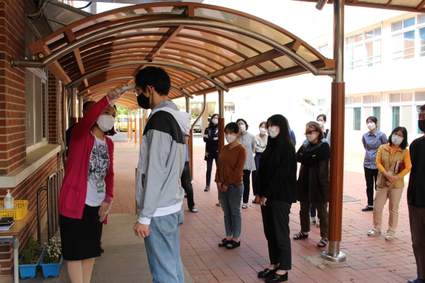 이날 훈련에서는 시차 등교 학생 발열체크, 한 쪽 방향 통행을 위한 동선, 급식실 및 교실 거리두기를 위한 좌석 배치, 코로나 19 관련 유증상자, 의심자, 확진자 발생시 대처 매뉴얼 등에 대한에 가상 상황을 시나리오로 설정하여 현장 대응 능력과 각 부서별 연계성을 높이고, 학생과 교직원의 코로나 19 예방 및 신속한 처치와 전파 방지를 위한 실천적 행동요령을 숙지하는 데 초점을 두고 진행하였다.