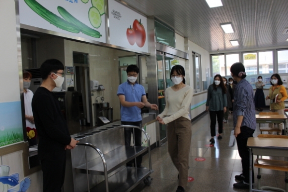 | 김천 금릉초등학교(교장 김현복)는 5월 20일(목) 본교 급식실과 현관 등에서 교직원 50여 명이 참가한 가운데 순차적 등교개학을 대비한 코로나 19 위기 대응 모의훈련을 실시하였다.