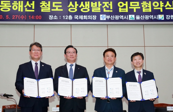 | 경상북도와 부산광역시, 울산광역시, 강원도 4개 시․도가 27일(수) 오후 2시 부산시청 국제회의장에서 ‘동해선 철도 상생발전 업무협약’을 체결했다.