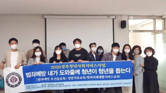 | 지난 20일, 김천대학교(총장 윤옥현) 청년사회서비스사업단(단장 김봉수 교수, 경찰행정학과 학과장)에서는 2020청년사회서비스사업의 일환인 범죄예방 및 호신술(경찰소방학부) 교육서비스와 범죄예방(사회복지상담학부), 상담치유 교육 서비스와 범죄피해 재활치료 서비스(물리치료학과)를 위한 사업단 발대식을 개최하였다. 고 29일 밝혔다.