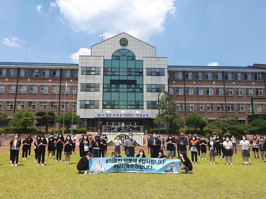 | 김천여자고등학교(교장 안중열)는 5월 29일(금) 코로나 19 치료 및 방지 확산을 위해 밤낮으로 애쓰시는 의료진들을 위해 ‘덕분에 챌린지’캠페인을 통해 존경과 감사의 마음을 표현했다.