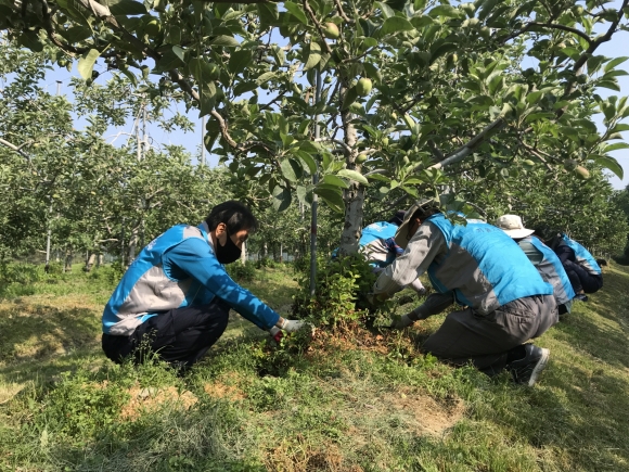 바쁜 업무를 잠시 접어두고 필수요원을 제외한 12명의 직원이 참여하여 사과 순지르기 및 적과, 제초 작업에 구슬땀을 흘렸다.