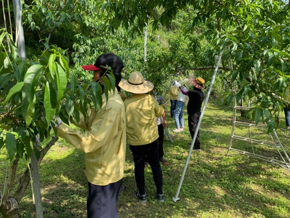 | 부항면(면장 장성윤)은 코로나19 장기화로 외국인 근로자의 입국이 어려워지면서 일손 부족현상이 심화되고 있는 농촌현실을 인식하고 복숭아 열매솎기 작업에 두 팔 걷고 나섰다.