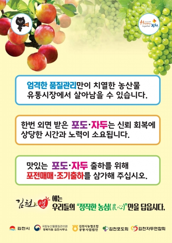 한편 김천시에서는 포전매매 및 미숙과 조기출하 근절을 위해 포도․자두 재배농가(3,585농가)를 대상으로 한 서한문 발송, 전단지 배부, 현수막 게첨, 작목반회의, SNS 등을 통한 계도 활동에 들어갈 예정이다.