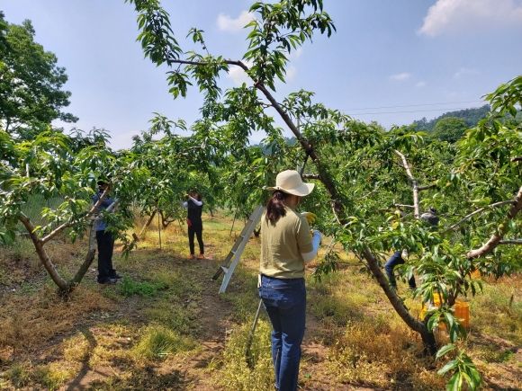 이날 일손돕기에는 문화예술회관 직원 11명이 참여하였으며 이른 아침부터 1,900㎡에 달하는 복숭아, 자두과수 적과 작업을 도우며 농가에 조금이나마 보탬이 되도록 구슬땀을 흘렸다.